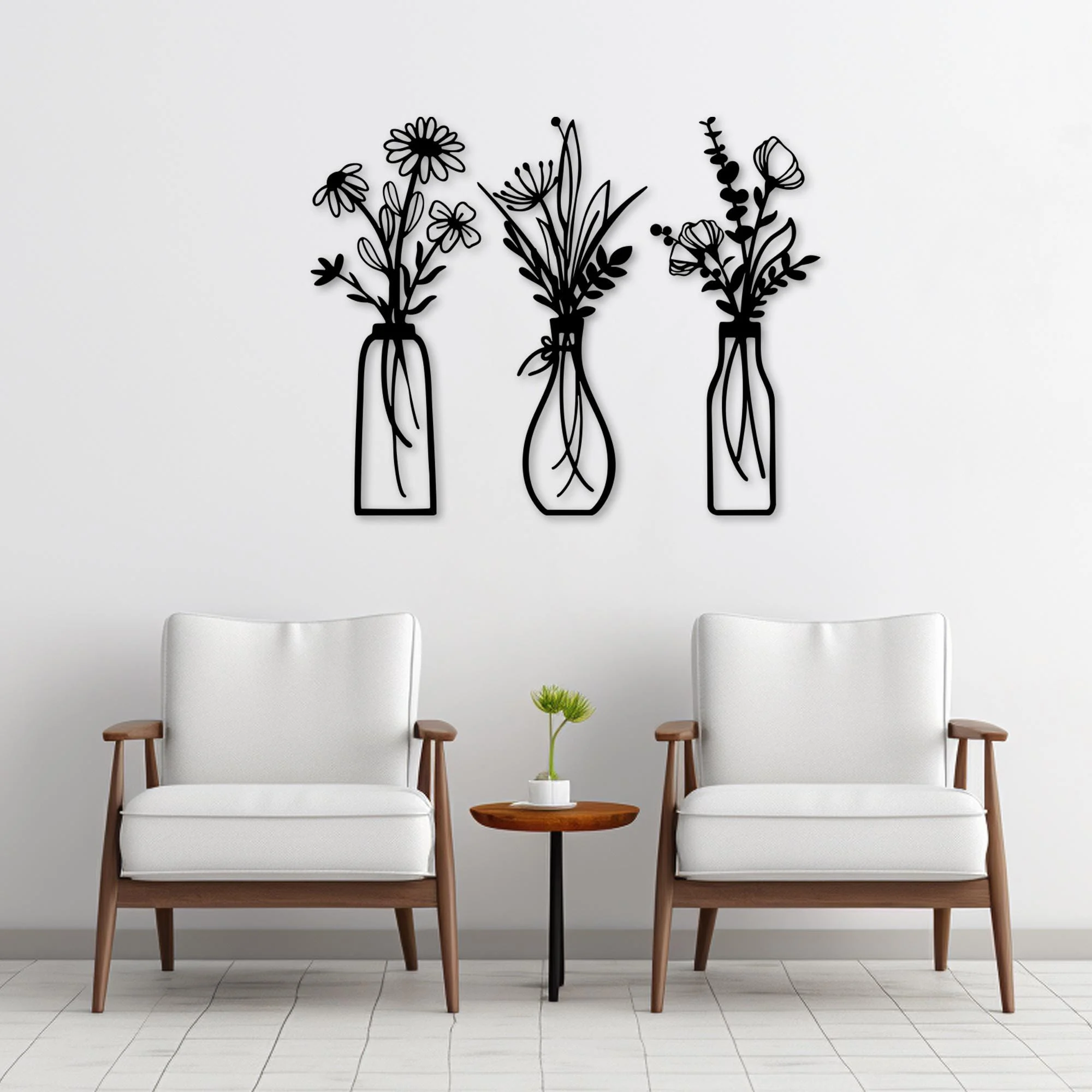 This is a set of minimalist metal wall art pieces, featuring three wildflower bouquets placed in different vases, crafted to bring a sense of elegance and modern simplicity to your space.