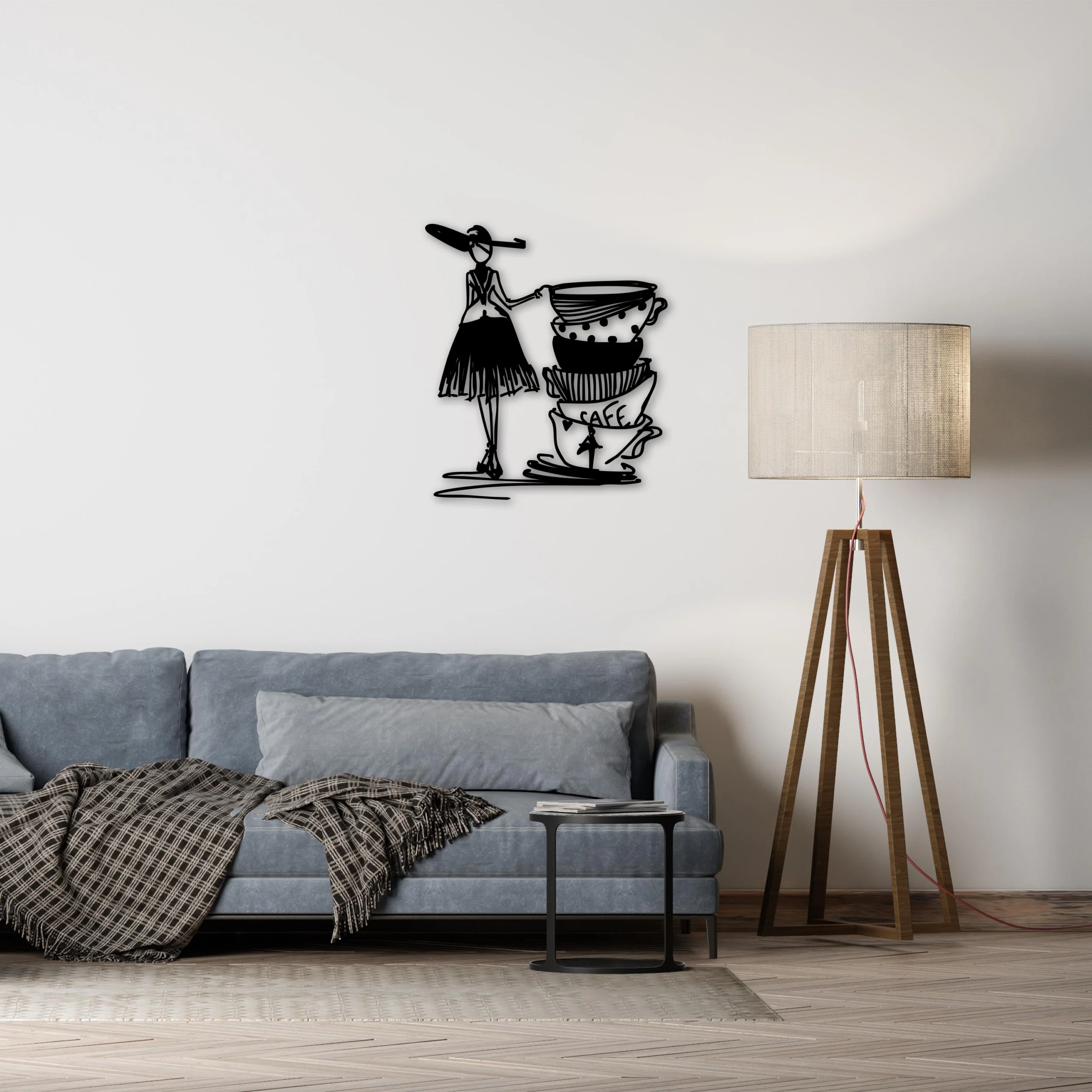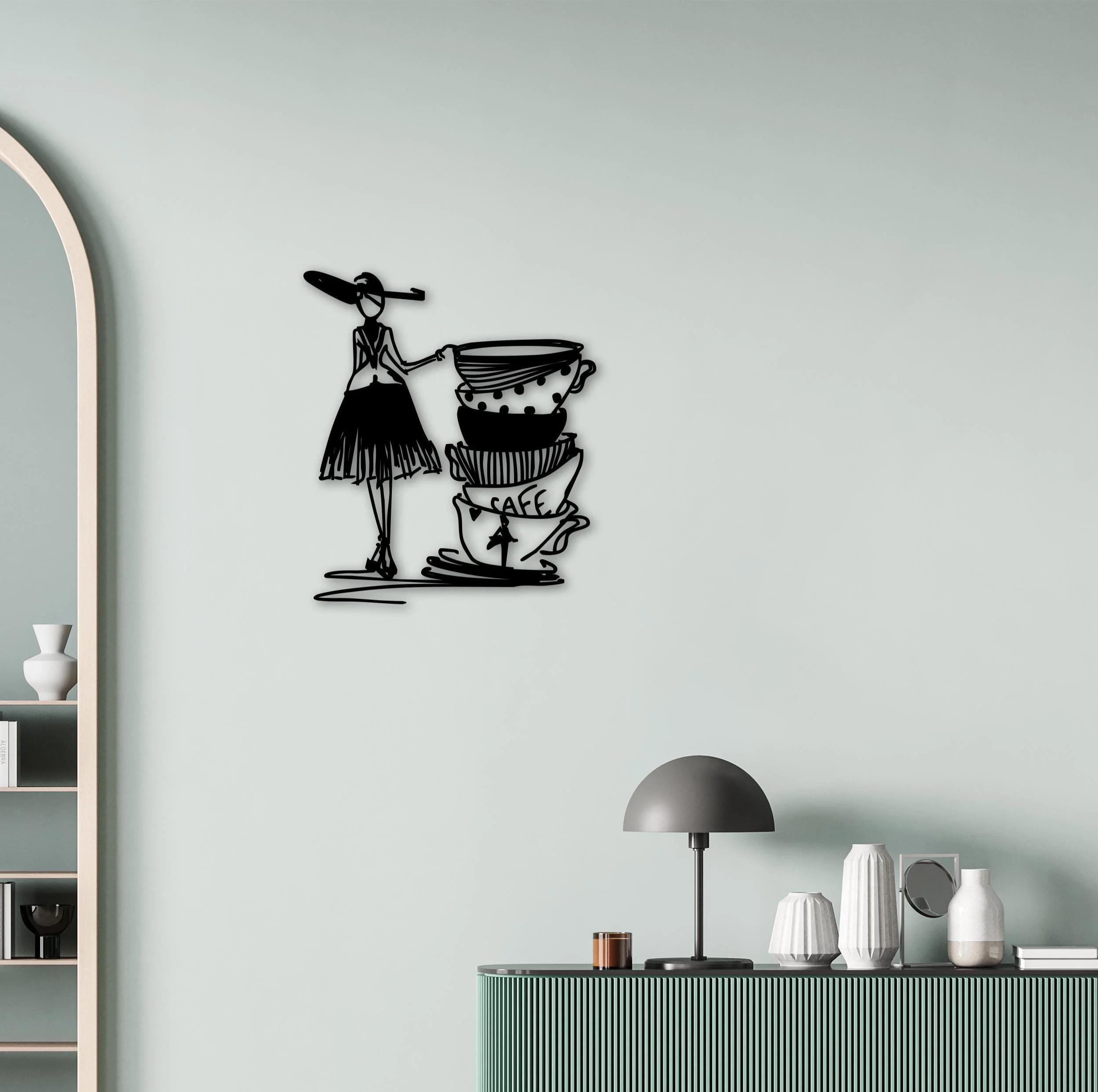 This elegant and playful metal wall art features a stylish lady in a flowing dress and wide-brimmed hat, leaning gracefully against a stack of whimsical coffee cups adorned with polka dots and the word “CAFE.” Rendered in continuous line art style, the design captures a unique blend of chic sophistication and minimalist charm—perfect for coffee lovers and art enthusiasts alike.